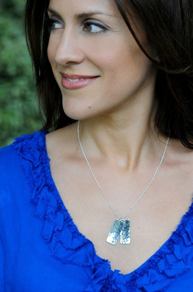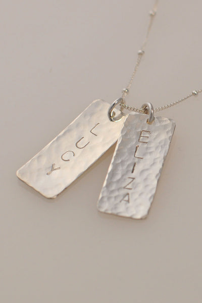 Hand crafted, hammered and stamped personalized Verticle tag on a chain.  Tag measures 1 1/4" x 1/2".  Can be made longer based on word and/or name.  One name per tag.  Lobster clasp closure.